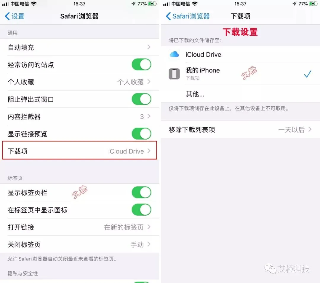 在手机的设置 → Safari 浏览器 → 下载项,可以设置文件储存位置,以及下载列表历史记录保存时间。