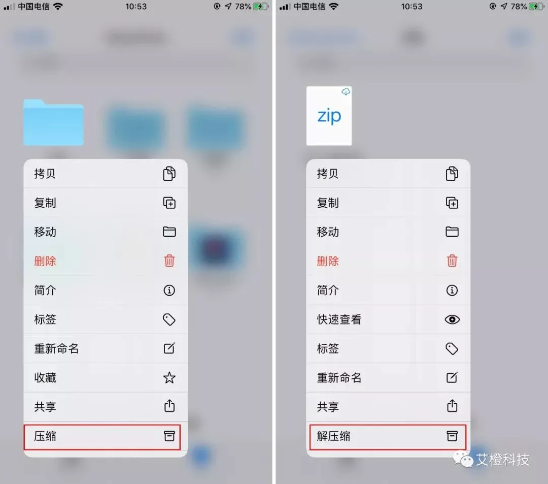 在iOS 13 系统,新增压缩和解压,文件App 终于支持这个功能了。支持整个文件夹压缩,但是不支持多选文件进行压缩。