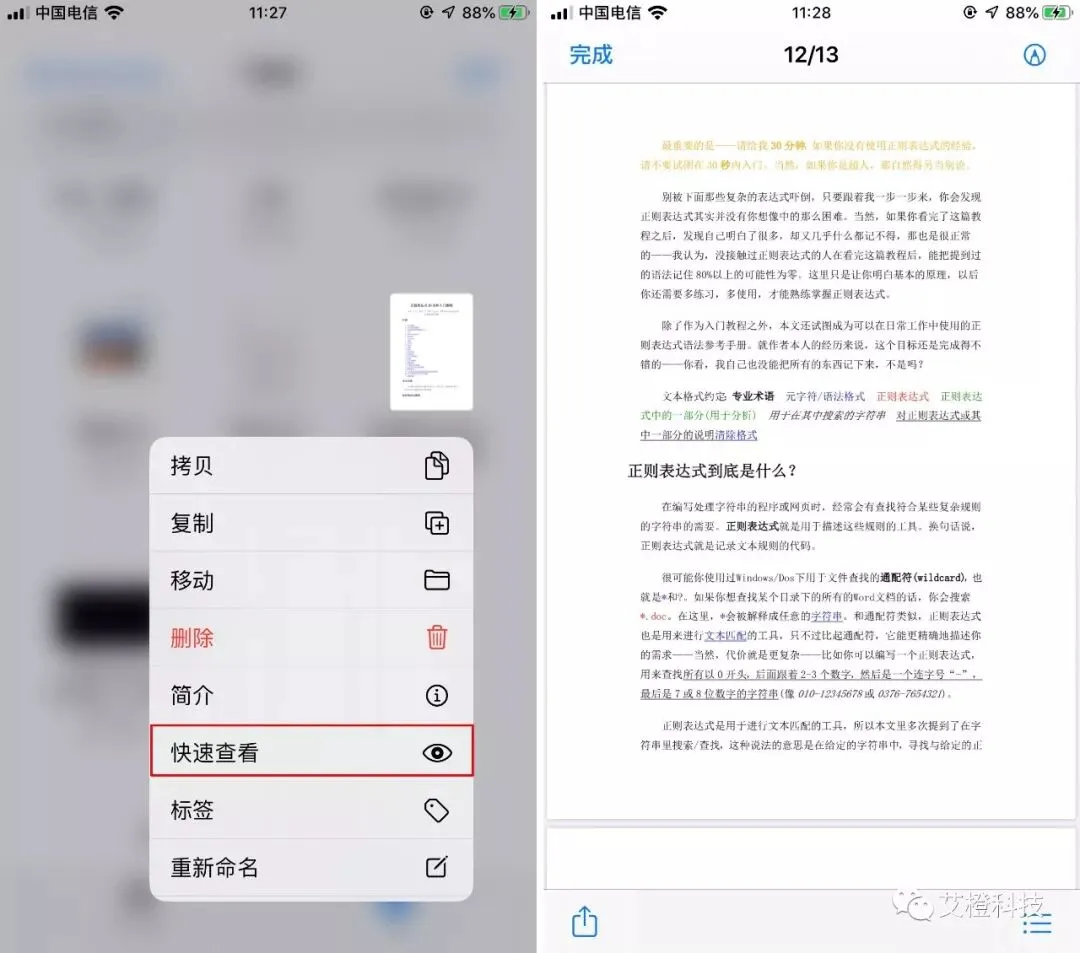 在iOS 13,文件新增快速查看功能,可以在文件App 中直接浏览文件,方便部分格式文件直接预览,无需借用第三方软件。