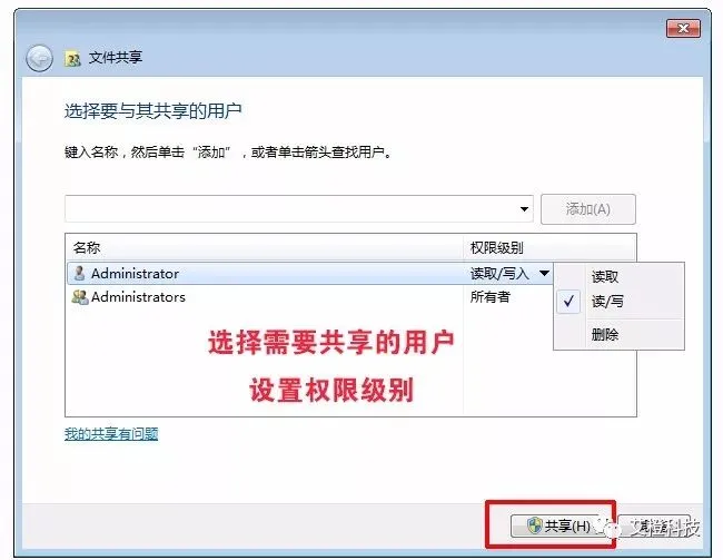 选择需要共享的用户,并根据需要设置权限级别“读取”、“写入”以及“删除”。然后点击右上角的“共享”进行设置。