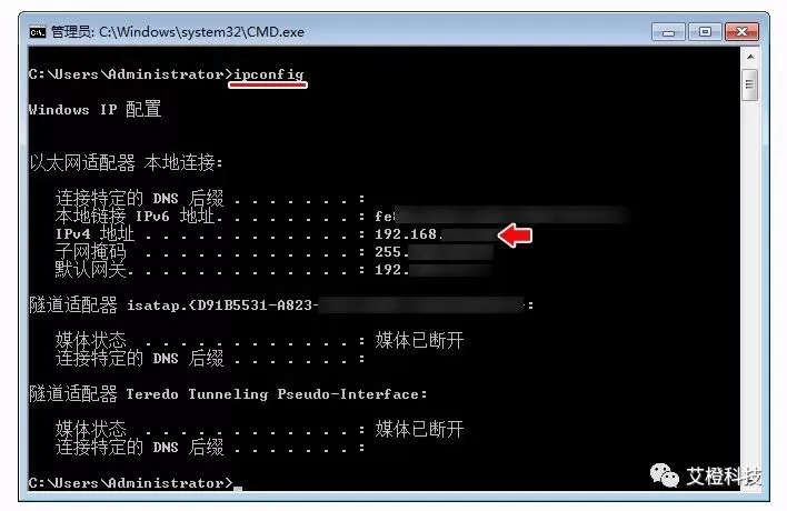 在命令提示符窗口输入“ipconfig”后,回车,就会出现本机的一些IP配置信息。其中,IPv4 后面的192.168.x.xxx 就是本机的IP地址了。这个地址就是用来连接SMB 的服务器地址。