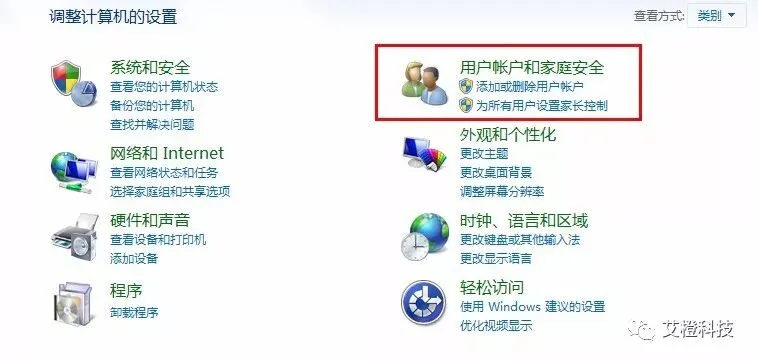 点击开始菜单,进入控制面板,选择“用户帐户和家庭安全”。