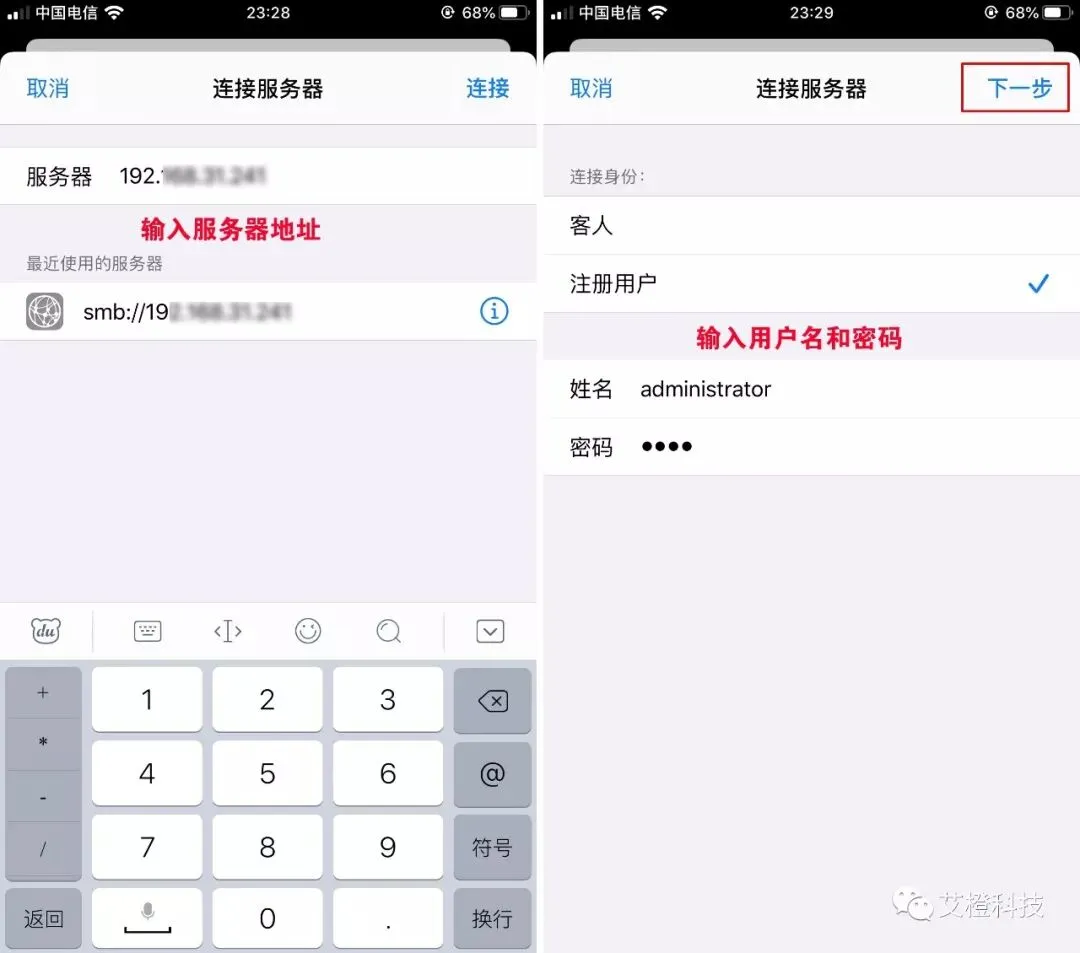 打开文件App,点击右上角“…”更多按钮,选择“连接服务器”。输入服务器地址,然后输入“姓名”和“密码”,点击右上角“下一步”就可以进行连接啦。