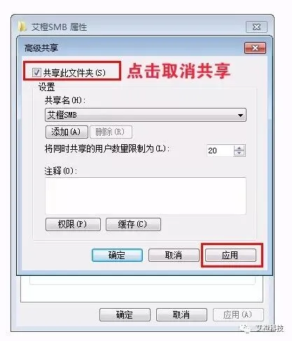 把“共享此文件夹”的钩取消,然后应用,就可以取消文件夹共享了。