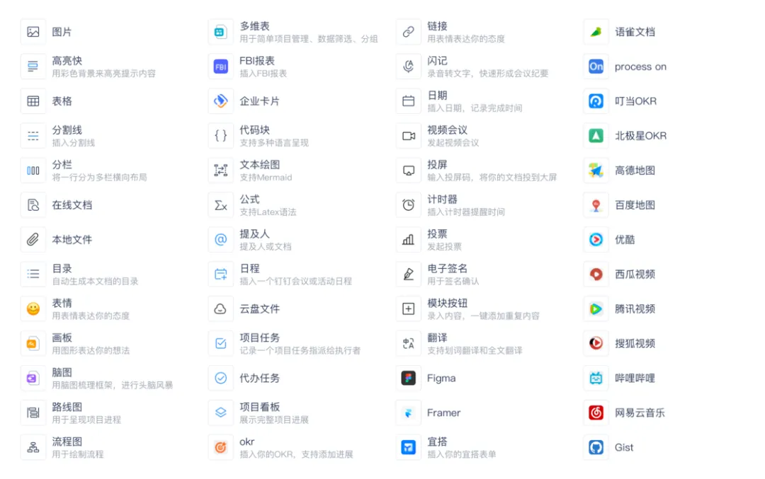 作为企业级的文档,必须要面对的是各类的复杂系统,因此这种 「/」 的连接和集成能力也进行了开放,可以集成企业的自建应用和第三方应用。