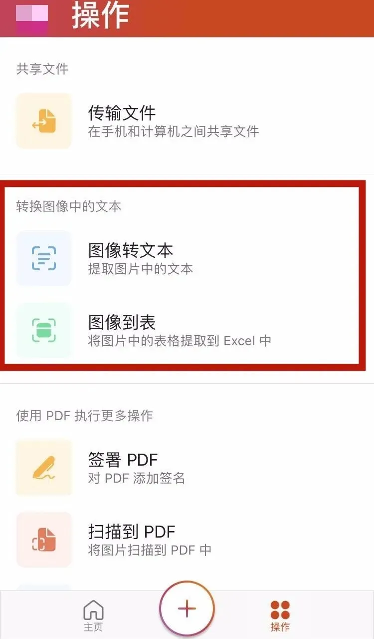 除了对办公文档进行处理,Office 三合一还整合了另一款独立应用——Office Lens。点击最下方【操作】。我们可以看到这些功能。