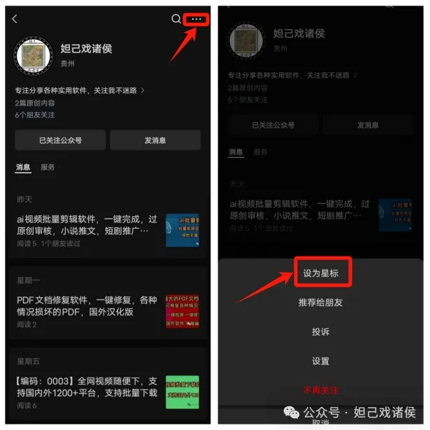 朋友们注意:妲己每天实时更新,但公众号信息杂乱,朋友们还是错过很多干货!建议朋友们把公众号置顶(设为星标★),第一时间就能看到本公众号推送,需要什么资源本公众号没有发布,可留言看到消息会帮忙查找,方法如下图: