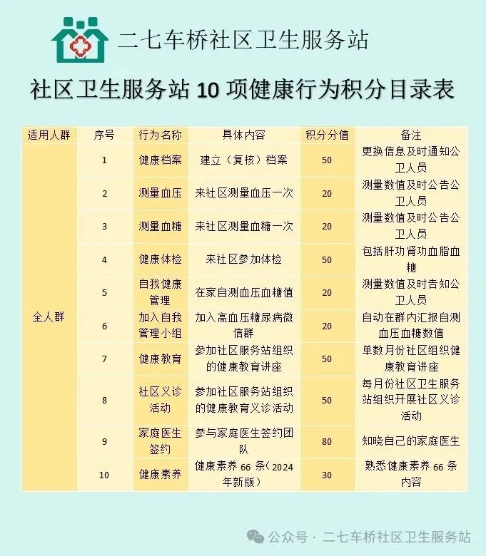 在二七车桥社区卫生服务站已建立居民健康档案的居民,可以免费领取一本居民健康积分手册,积分模块适用人群包含所有人,以高血压、糖尿病患者、65岁及以上老年人为重点人群。