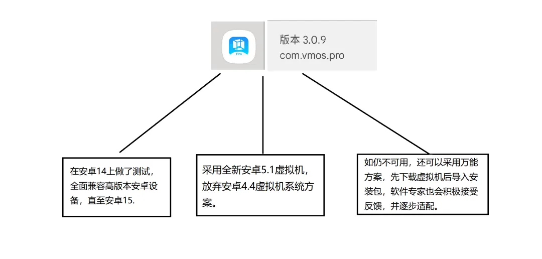 所以软件专家此刻决定,针对高版本安卓用户,提供最新兼容安卓15的vmospro3.09,并取消安卓4.4系统方案,转而使用基于安卓5.1或者更高版本的虚拟机。软件专家已经制作了基于安卓5.1的新虚拟机,并会同时分享虚拟机文件,游戏apk,和vmospro的安装包。