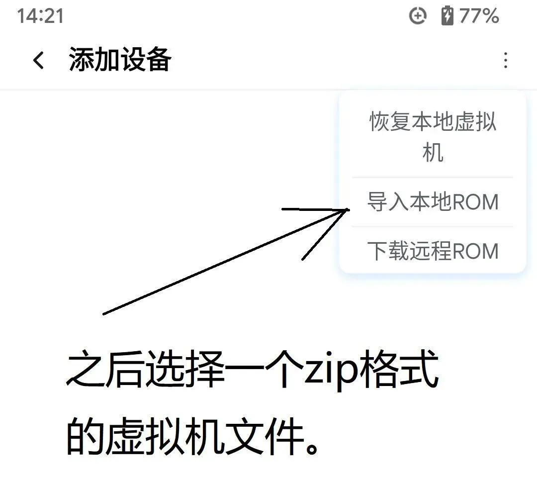 下载我分享的zip格式的虚拟机文件,有几百mb到1gb多的大小,在vmospro找到添加按钮,然后找到导入本地虚拟机功能,提前授予存储权限,访问所有文件权限等,点击我分享的zip格式虚拟机,等待导入成功。导入后自动安装并启动,此次是安卓5.1虚拟机,且我在安卓14的手机上面测试有效,这次应该能进入虚拟机内部。
