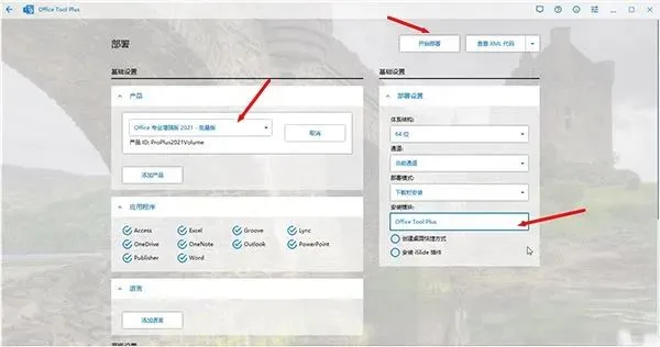 5、在安装office之前一定要卸载之前的旧版本,在产品选项中选择office专业增强版2021,选择64位,还需要选择office tool plus安装模块,点击右上角的开始部署;