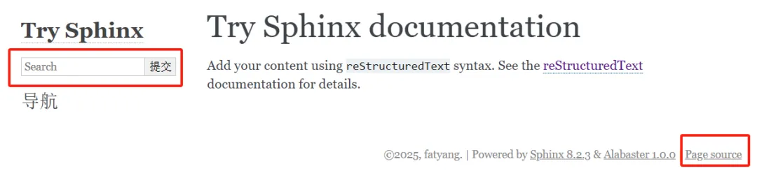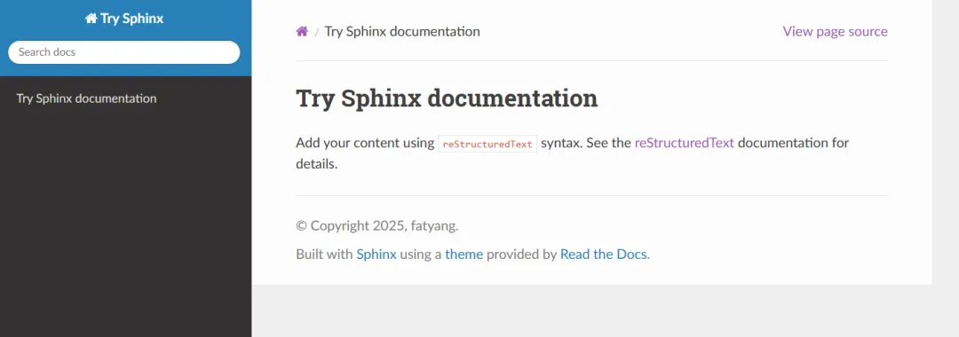 可以看到,还是比较高级的,还自带有搜索框,同时作者的名字也自动加入其中。当点击 Page source 后会出现原本 index.rst 文件内容: