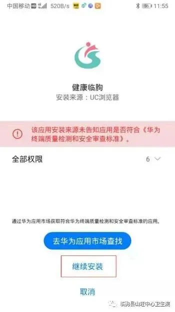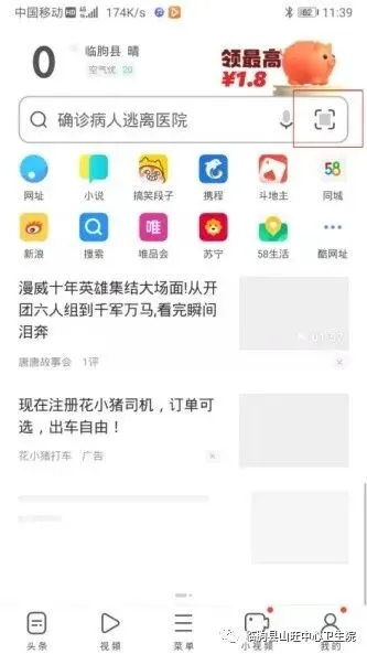 第一步:打开手机中的任意浏览器(以UC浏览器为例),扫描二维码下载安装“健康临朐”APP。
