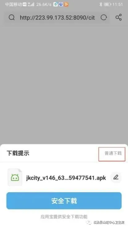 对准健康临朐APP二维码进行扫码后会跳转至下载界面,点击普通下载进行下载: