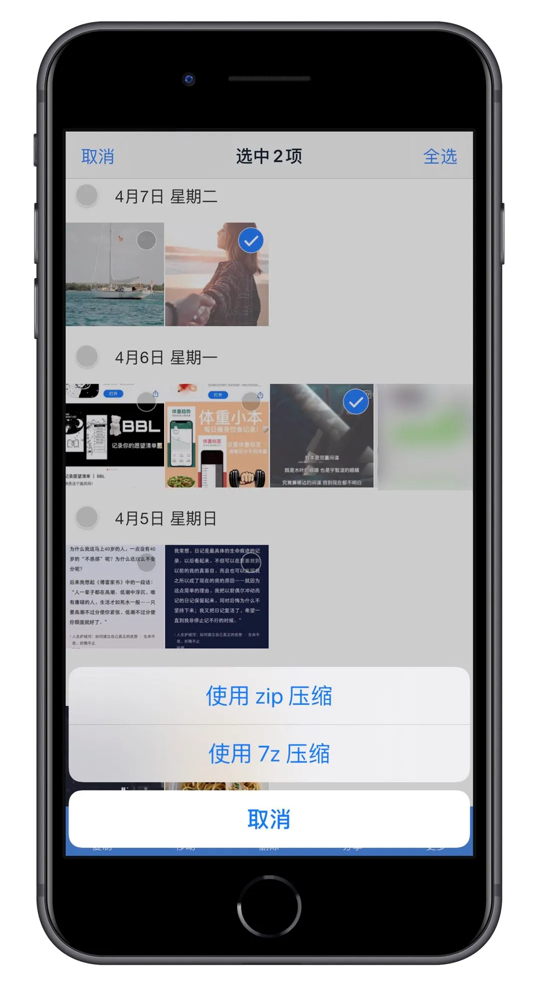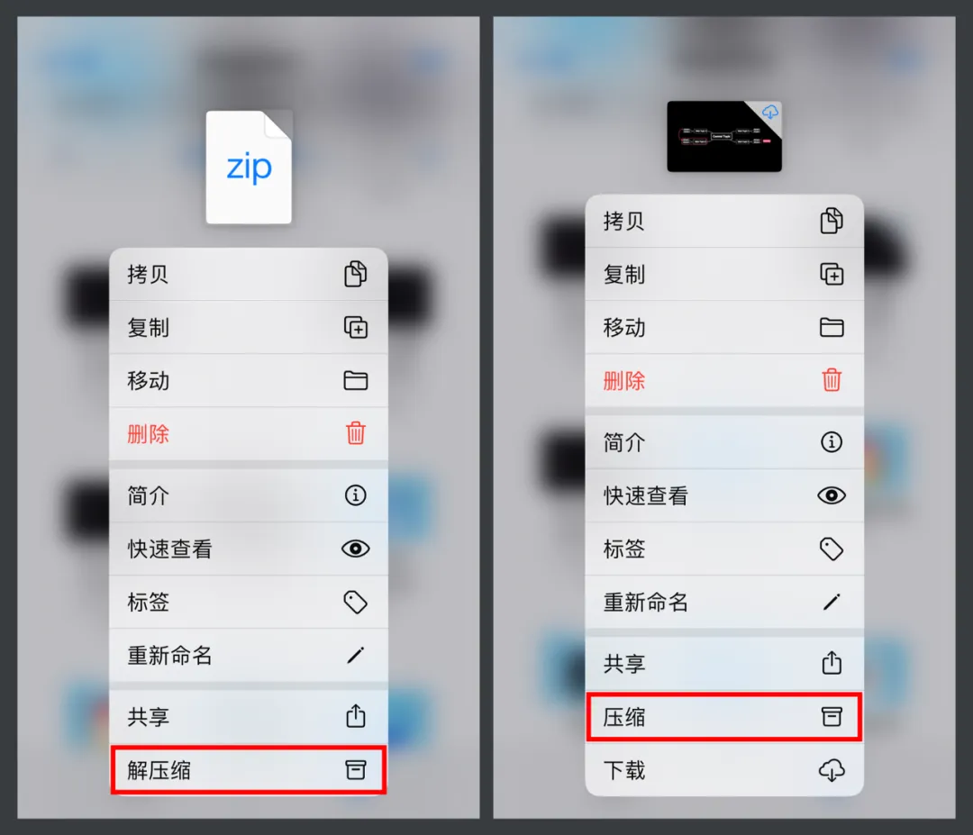文件 App 新增了压缩与解压缩功能,选中任意文件并长按,在弹出的菜单中,可选择「压缩」,压缩之后可得到一个 zip 格式的压缩包。