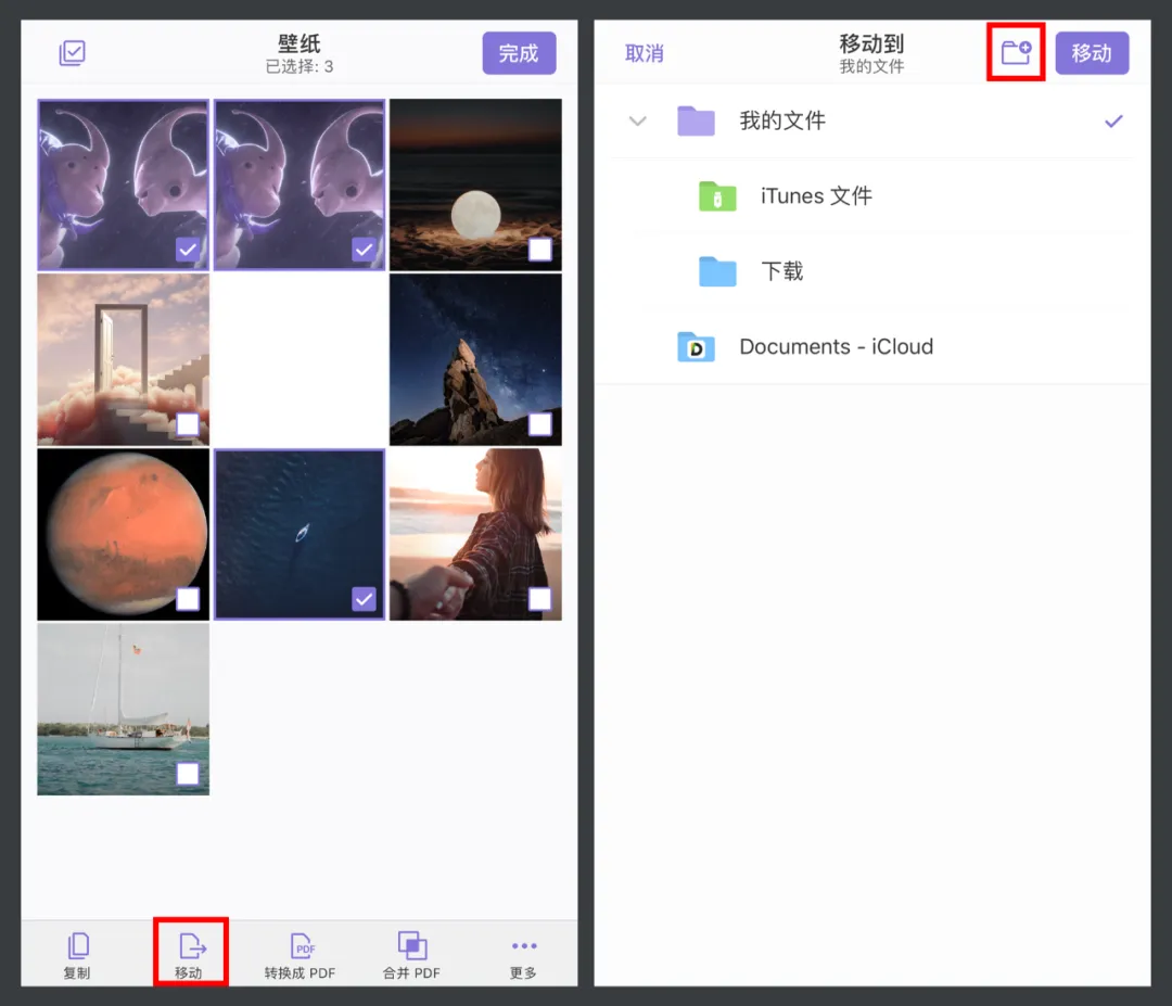 进入任意一个相册,可同时勾选多张照片,点击底部的「移动」,在弹出的页面中,可创建新的文件夹,将照片移动到新的文件夹中。