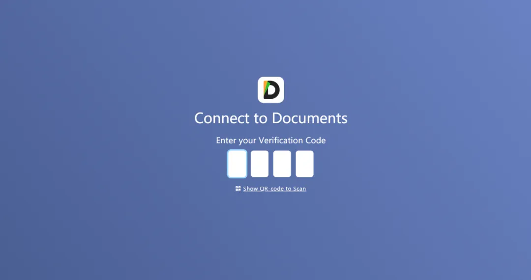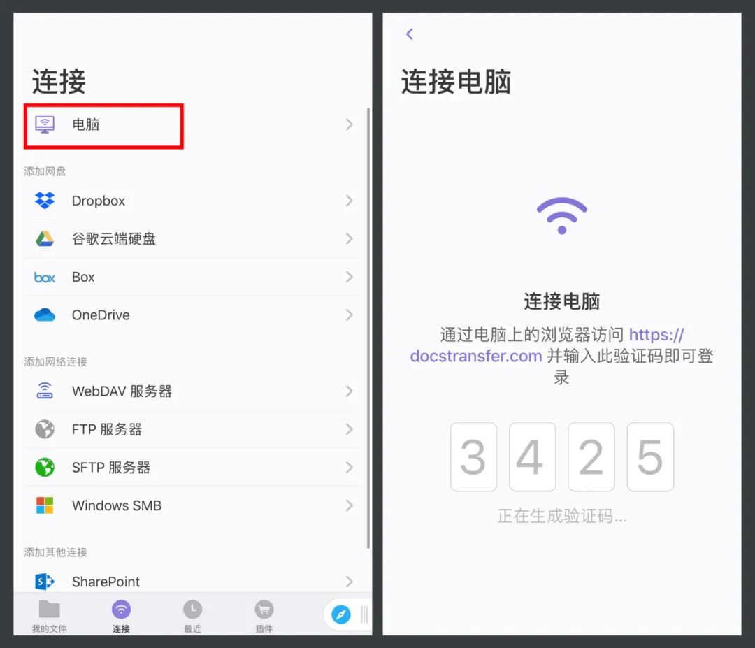 在电脑浏览器访问 https://docstransfer.com ,在打开的页面中输入 App 生成的验证码,手机和电脑间就可以互通了。