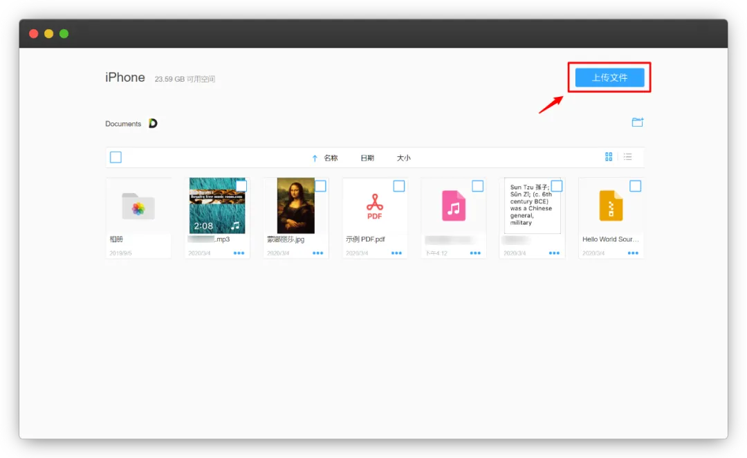 点击右上角的「上传文件」,可以将电脑的文件传输到手机上。