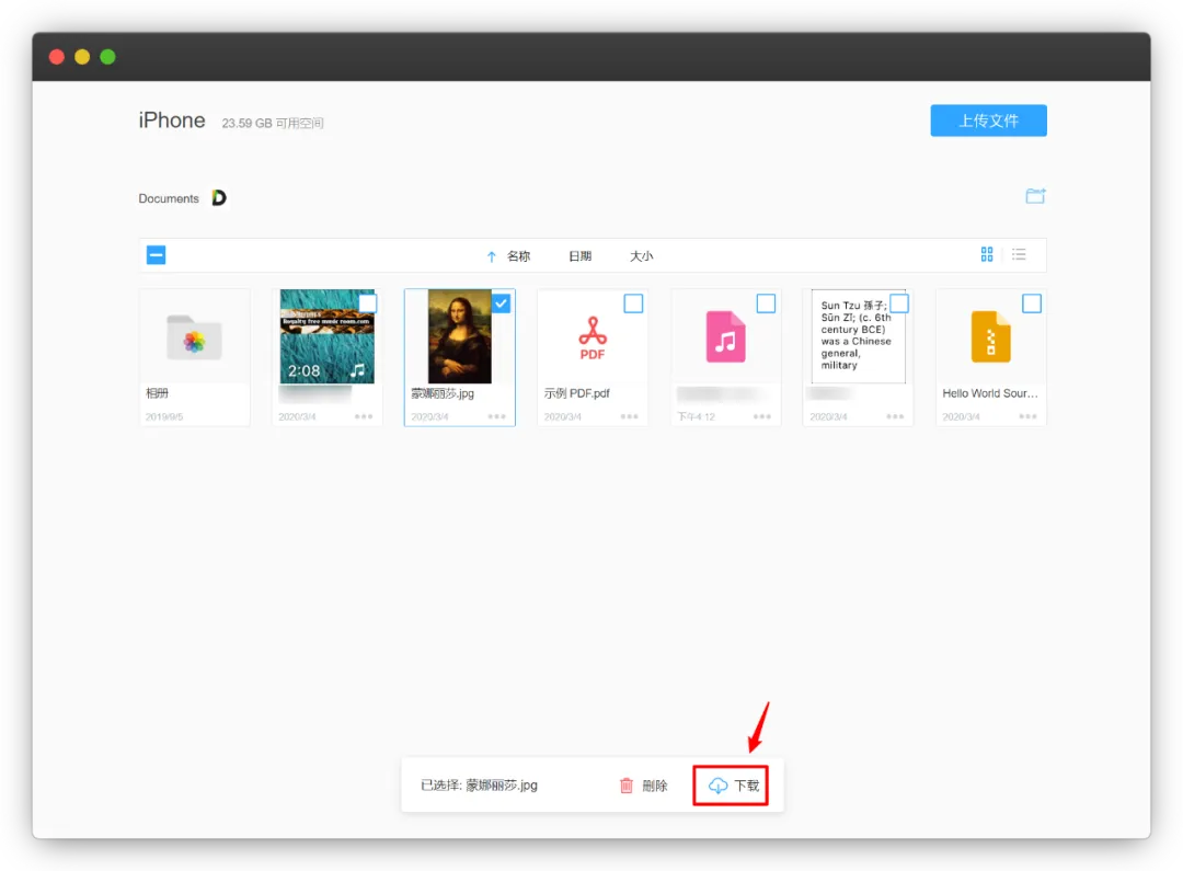 Documents 支持双向传输,选中想要从手机传输到电脑的文件,页面下方会显示被选中的文件名称及「下载」的选项,选择下载即可完成传输。