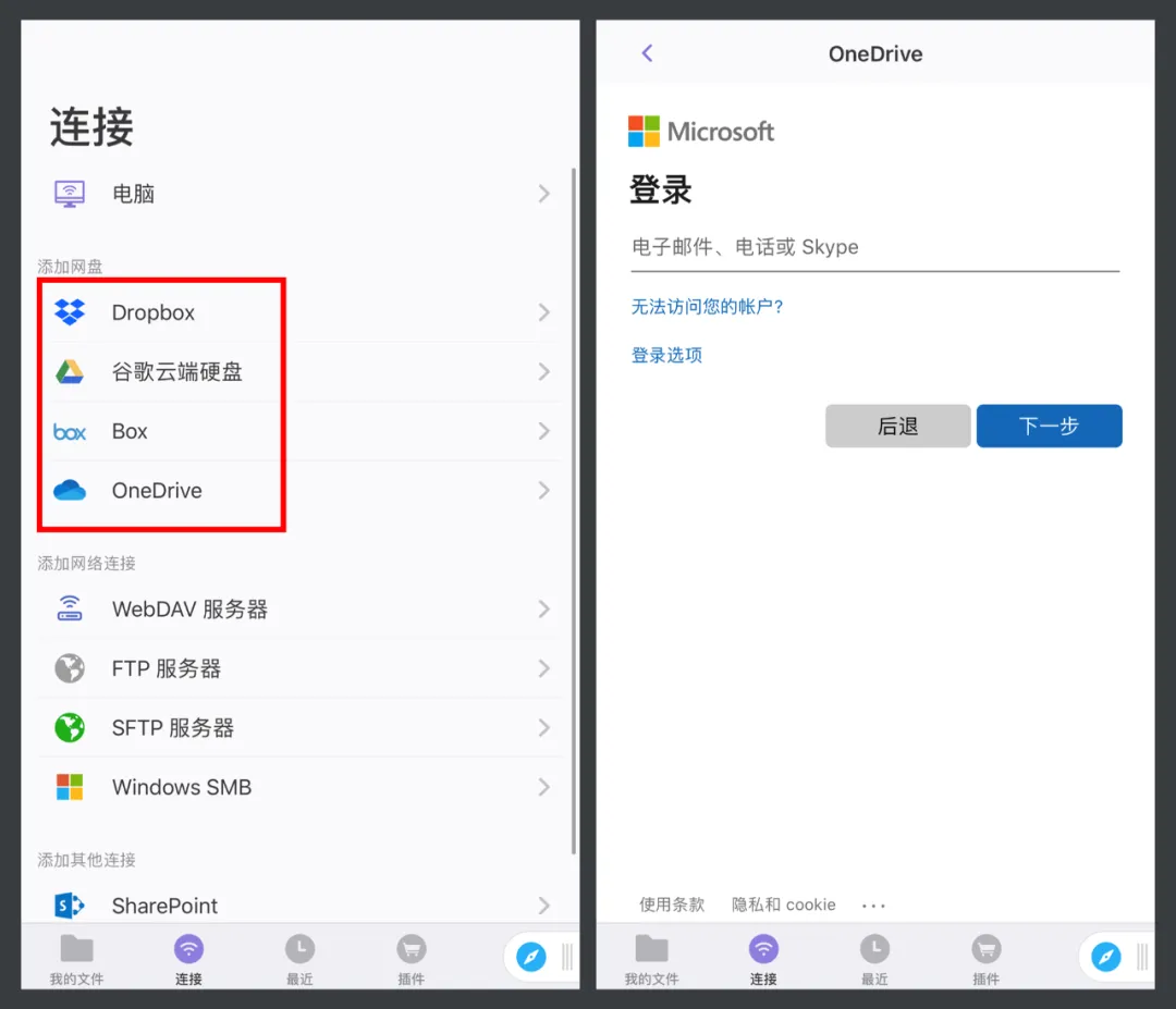 Documents 可以访问的网盘应用有 Dropbox、谷歌云端硬盘(Google Drive)、Box 和 OneDrive,但有些遗憾的是,这些网盘都是国外公司的网盘,在访问体验上可能稍有不足。