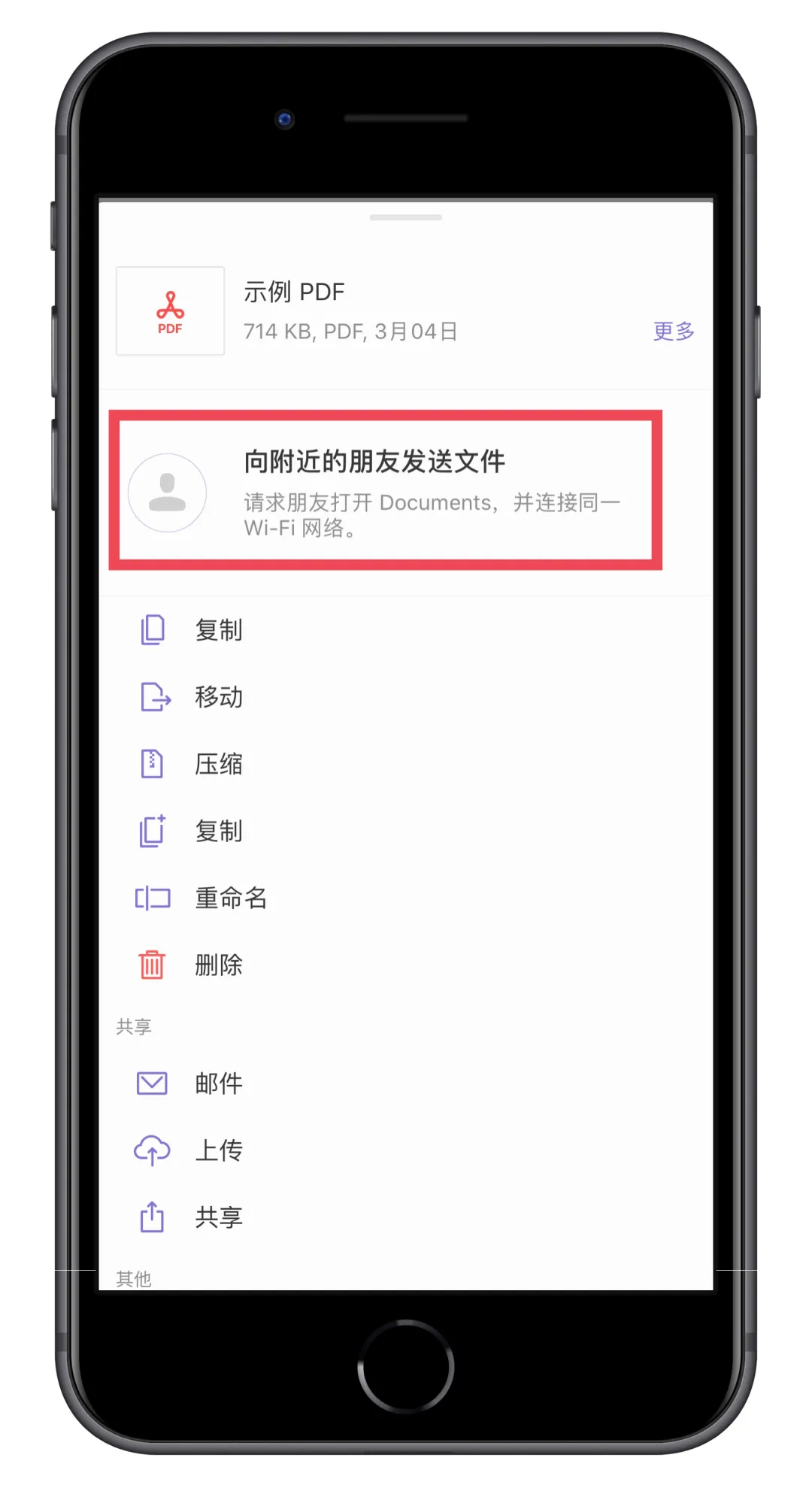 Documents 内置了「发送文件」的功能,文件接收双方都需要安装 Documents,并且连接到同一 Wifi 网络,这让我想起了安卓上以前非常流行的文件传输工具「快牙」。