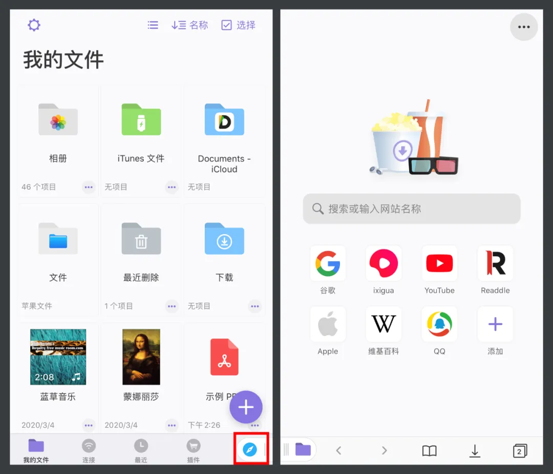 除了文件管理,Documents 还可以作为一个下载工具,点击 App 右下角的「指南针」图标,可以进入 Documents 内置的浏览器页面,如下图右侧。