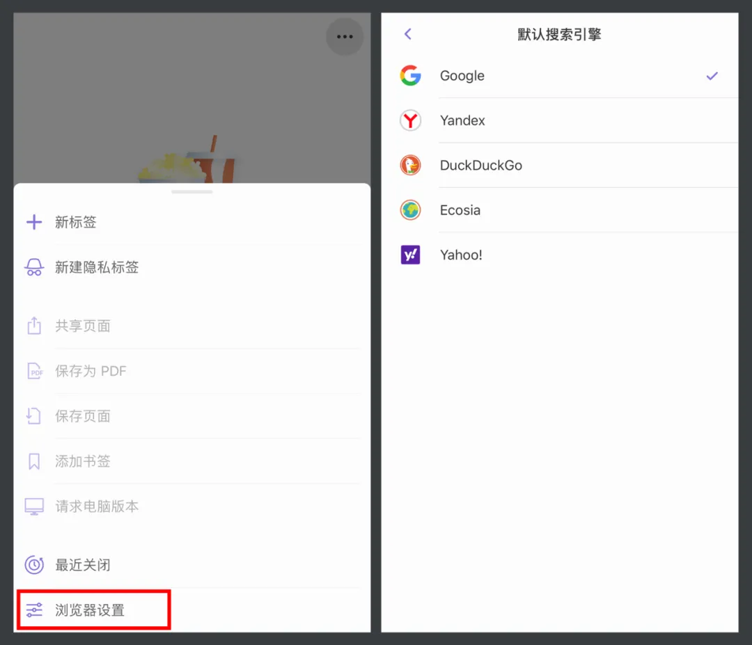 浏览器首页与大多数浏览器有些相似,默认的搜索引擎是 Google,点击右上角的设置按钮,选择「浏览器设置」,可以修改默认的搜索引擎,但可供选择的搜索引擎都是外国的。