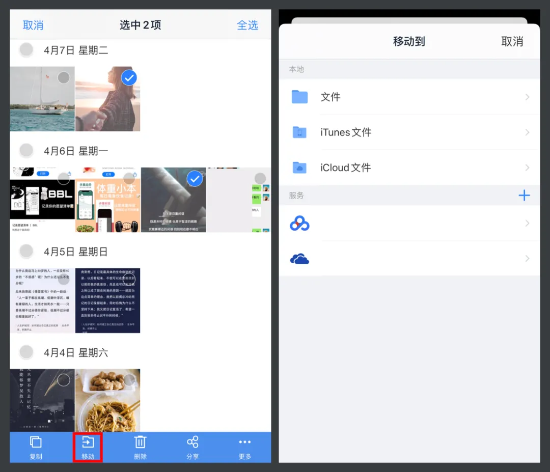 选中拟归档到同个文件夹的多张照片,选择下方的「移动」,在弹出的页面中,你可以将照片移动到其他本地文件夹中,也可以上传到网盘中。