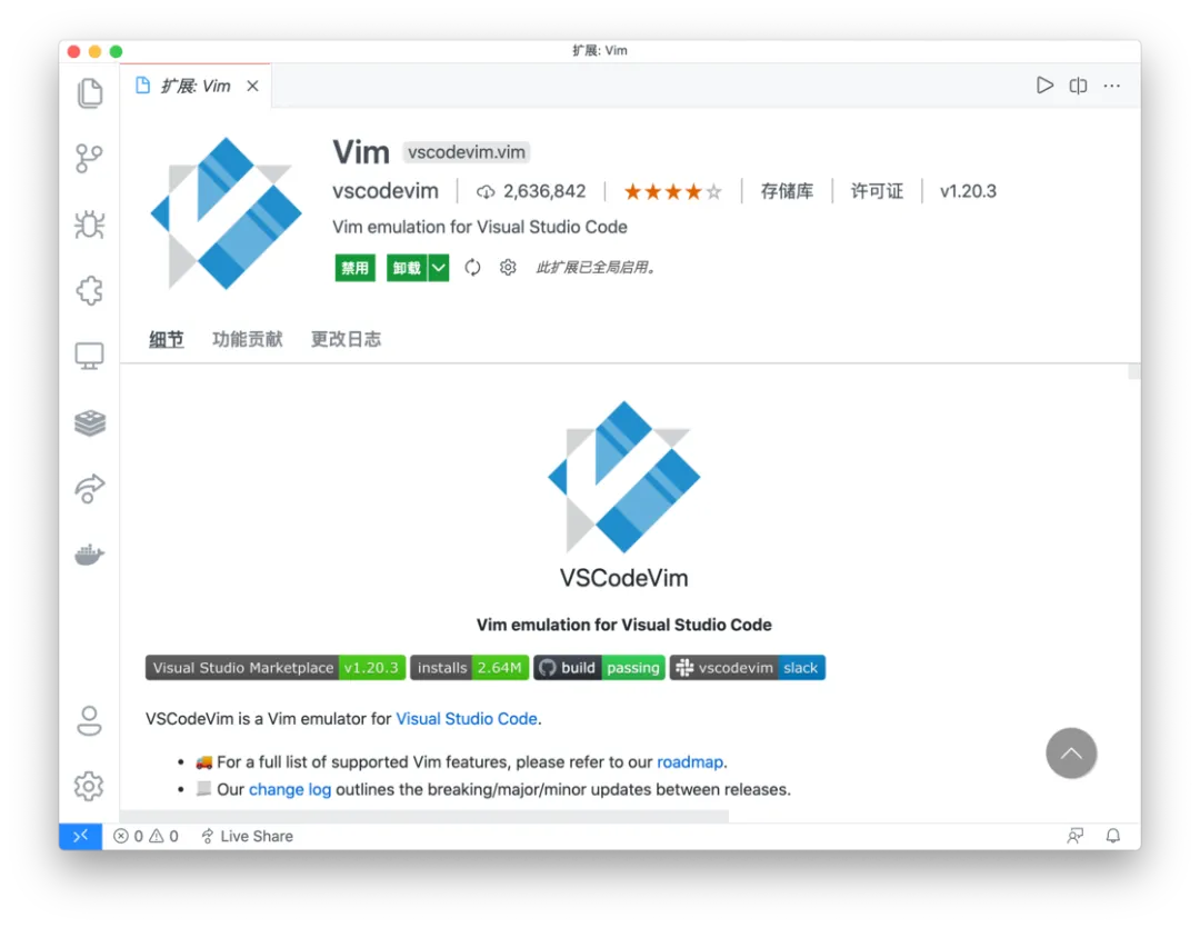 VS Code 本身自己有一套支持对可编辑内容操作的快捷键,但因为我本身就习惯了借助 Vim 用键盘来操作的方式,因此就没有打算增加额外的学习成本,选择了目前下载人数最多且同名的 Vim 插件来进行操作。