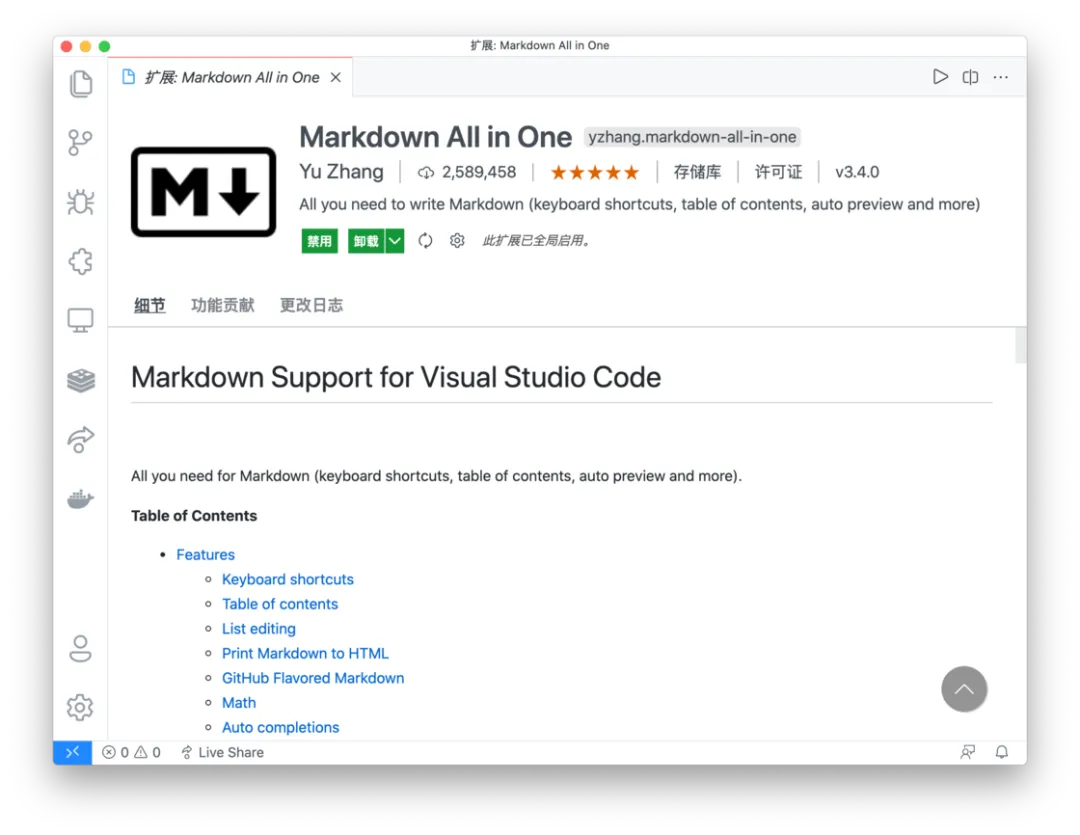 VS Code 上有着丰富的 Markdown 插件,而当中的 Markdown All in One 是让我体验较好的一款。通过它我们能在 VS Code 上能享受相对完整的 Markdown 体验,包括 Markdown 语法、代码块、数学公式等等。