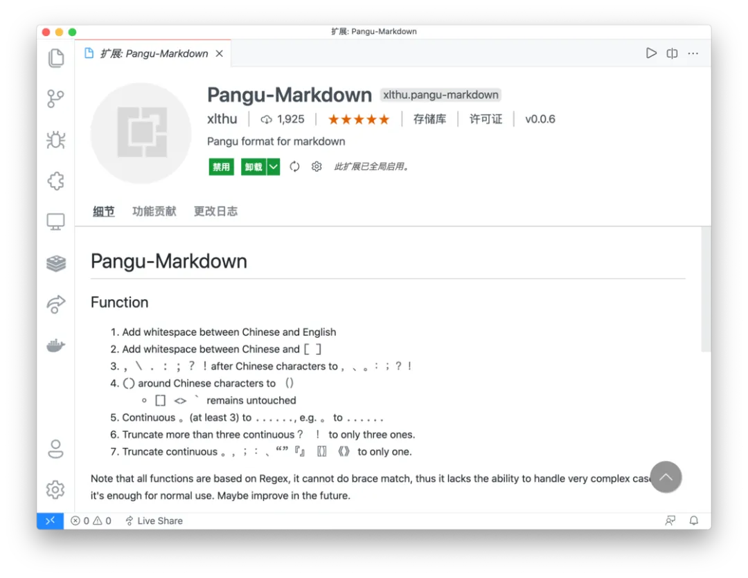 原生的 pangu 并非是 VS Code 插件,而是需要每次运行程序才会对目标文档进行格式化。所以目前我使用的是名为 Pangu-Markdown 的 VS Code 插件。