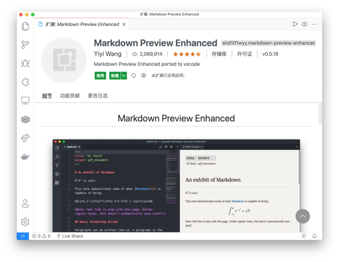 因为我们在 VS Code 使用 Markdown 都是以原生语法的形式来书写内容,若想要查看渲染排版后的内容,需要进行预览。前面提到的 Markdown All in One 插件本身也提供了预览功能,但是比较简陋。所以我就额外使用了另外一款名为 Markdown Preview Enhanced 的 Markdown 内容预览的增强插件。