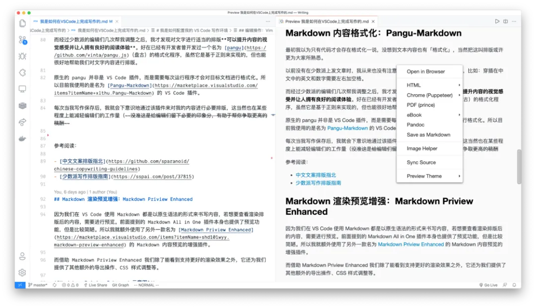 选择 Vim 操作的原因在于减少因需要调整内容而打断我写作时的专注过程,当然如果习惯了 VS Code 的快捷键,也能够一定程度上帮助达到和 Vim 类似的效果。