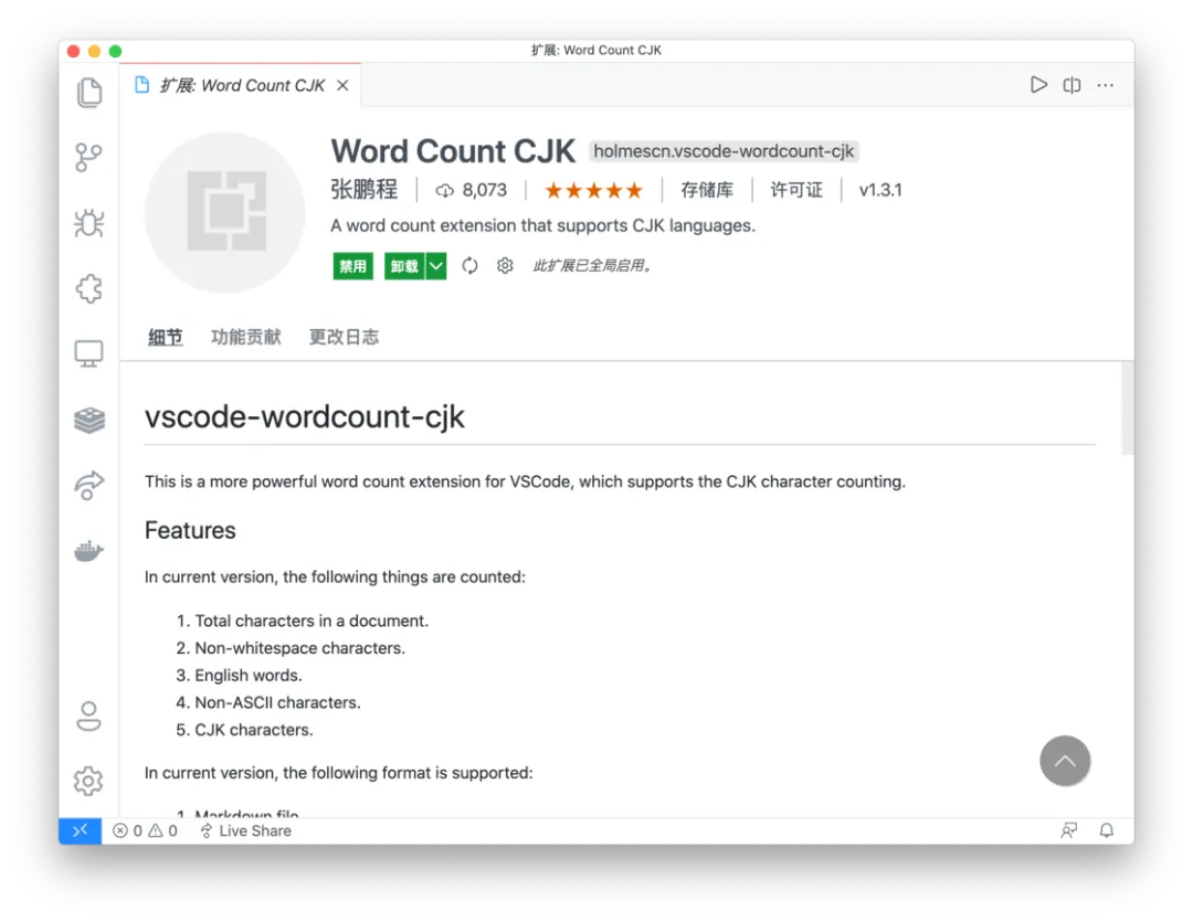 Word Count CJK 是一个专门用于中文字数统计的 VS Code 插件,装上了它之后无论我们是在普通文本格式还是 Markdown 格式中写作,都能在 VS Code 底部的状态栏中帮我们很好地显示目前我们写作的篇幅字数是多少。