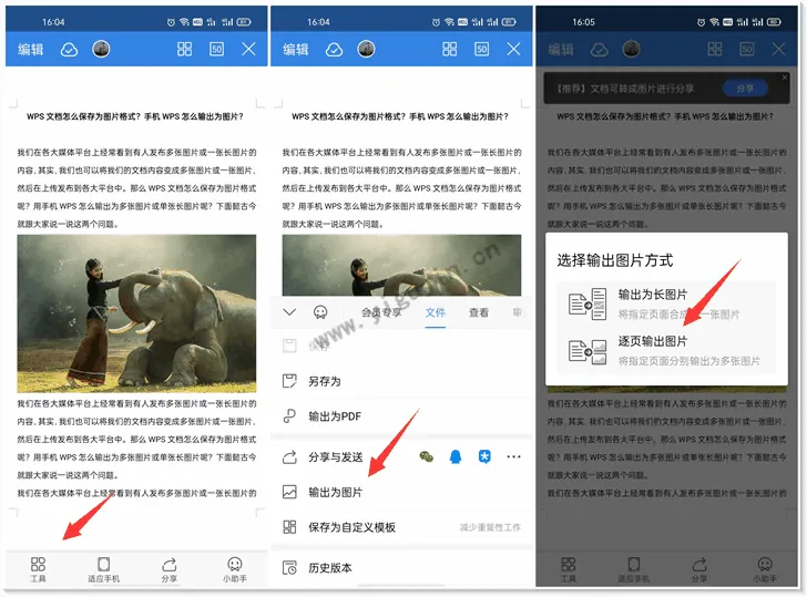 1、打开手机上的WPS Office打开需要输出为图片的WPS文档 >> 点击左下角的“工具”>> 点击“输出为图片”>> 选择输出图片方式,可选长图片或逐页输出图片,这里老古选择“逐页输出图片”。