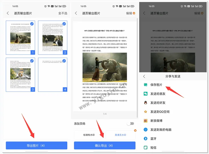 2、默认全选WPS文档的所有页码,也可以选择其中的页码,点击【导出图片】按钮 >> 选择水印选项后点击【确认导出】按钮 >> 点击“保存图片”即可将该WPS文档输出为图片并保存在手机相册中(PS:也可以根据实际需求选择其他方式,如发送给朋友)。