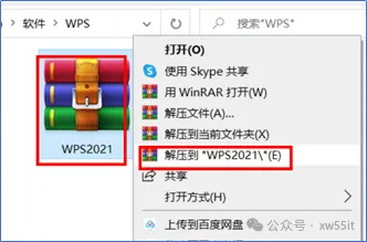 1、找到下载“WPS2021”压缩包,鼠标右键,选择“解压到WPS2021”,将压缩文件解压。