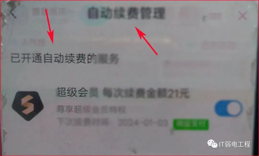 点开自动续费菜单,会看到以下的画面:自动续费管理,下面一行有”己开通自动续费的服务“,在其右边出现:超级会员每次续费金额21元,旁边有一个打开的开关,说明自动续费功能是打开的,这就是导致每个月自动扣费的原因,我们关闭它就是.