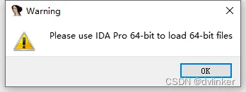 点击New按钮去反汇编一个新的文件,然后弹出IDA的主窗口。然后直接将libxxservice_hddll.so文件拖入到IDA主窗口中打开,会提示使用64位的IDA打开该文件,如下: