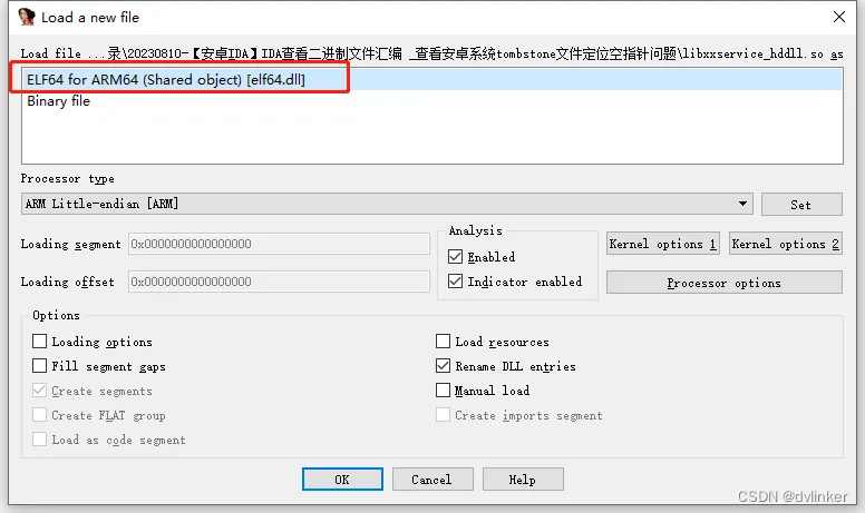 于是通过桌面快捷方式找到安装路径,到路径中启动64版本IDA,然后将libxxservice_hddll.so拖入到IDA主窗口中,然后会弹出选择打开二进制文件的格式,如下所示: