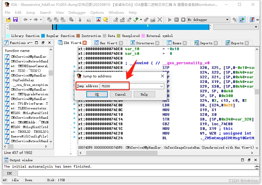 然后在IDA中搜索该地址0x0000000000075200,找到对应的汇编代码行。具体的做法是,将鼠标点进汇编代码窗口中(使该窗口获得焦点),然后按下快捷键g,弹出Jump to address窗口,输入上面计算出来的地址0x0000000000075200: