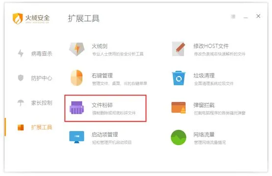 在软件窗口中点击左侧的“扩展工具”按钮,找到“文件粉碎”,点击并下载该功能模块,之后进入操作界面。