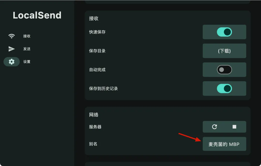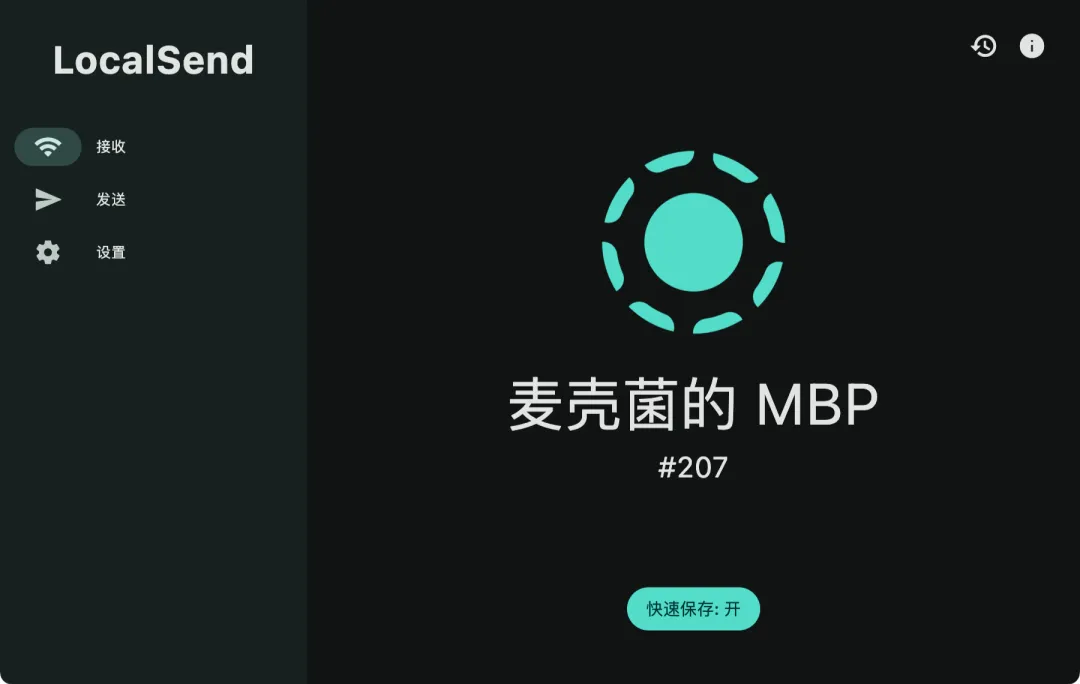 LocalSend 界面干净简洁,无广告,操作简单。主页面只有「接收」、「发送」和「设置」三个选项。「接收」页面显示的是当前设备的名称,并有一个快速保存开关,如果开启快速保存,将允许同一局域网内的所有设备向你传输文件。