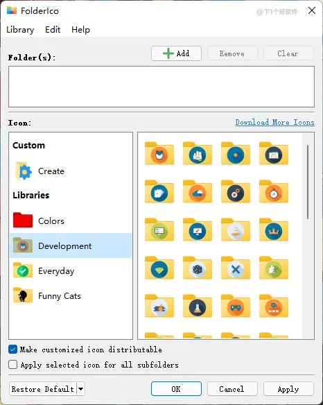 目前这款软件上架在微软应用商店,你可以给指定的文件夹修改颜色、或者用自带的文件夹图标替换,当然也支持导入图标包。