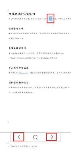 5、进入搜索页面后,可以在文档内看到查找到的内容,点击下方的左右键,查看上一个、下一个搜索结果,如果需要退出搜索,可以点击导航键的返回键退出;