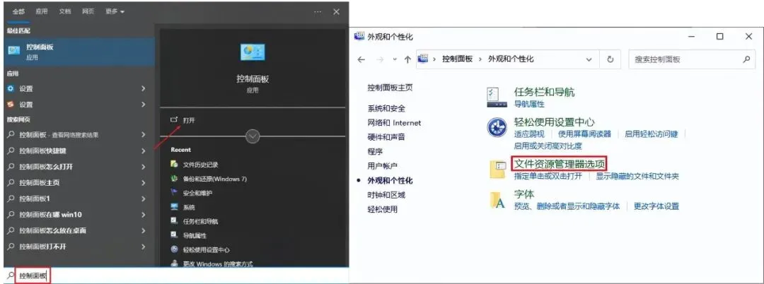 2. 在“外观和个性化”中找到并进入“文件资源管理器选项”。