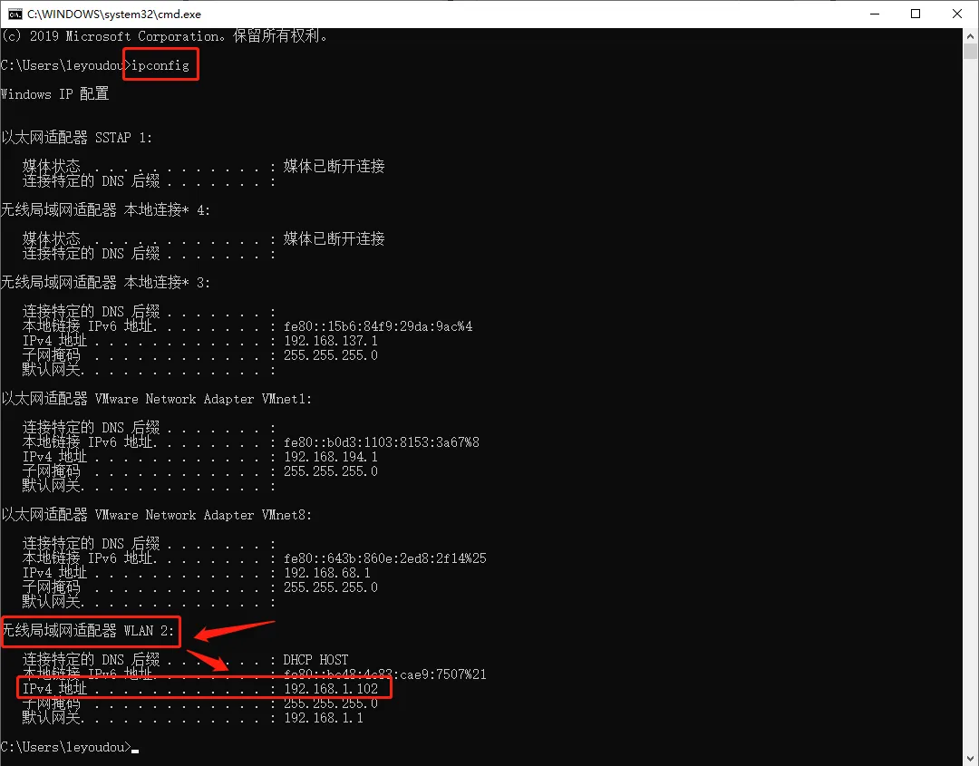 在窗口中输入「ipconfig」,敲击回车键,将会得到 IP 配置内容。记下「IPv4 地址」信息。