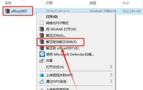 1.打开下载的office2007软件压缩包,鼠标右击选择【解压到当前文件夹】。
