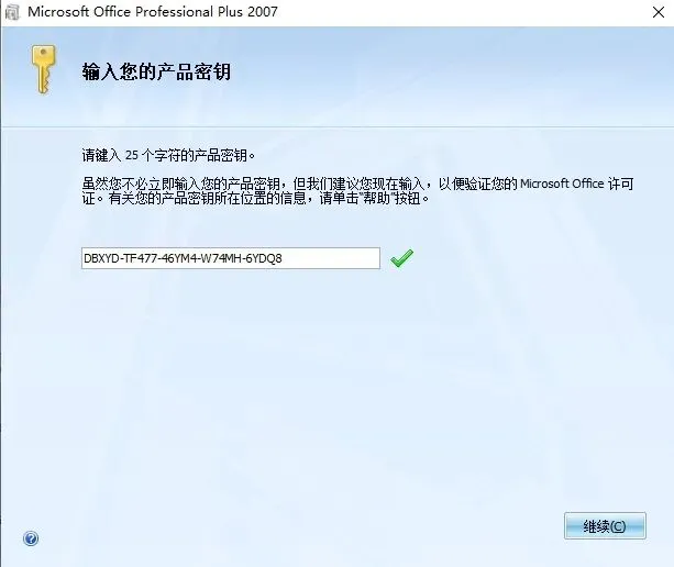 5.输入产品密钥:DBXYD-TF477-46YM4-W74MH-6YDQ8 . 然后点击【继续】。