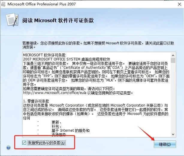 6.接受协议,点击【继续】。
